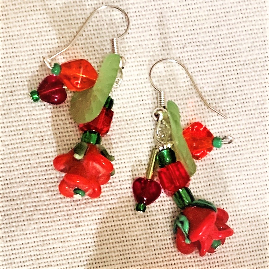 See my latest collection of earrings and a necklace in my new “Bellflowers” range. I’ve bought some most beautiful bell-shaped flower beads in several colours. Some are glass; some acrylic. My first few Bellflower earrings are on a short drop and quite shiny and delicate; latest ones are on a longer drop, with toning beads and spacers.