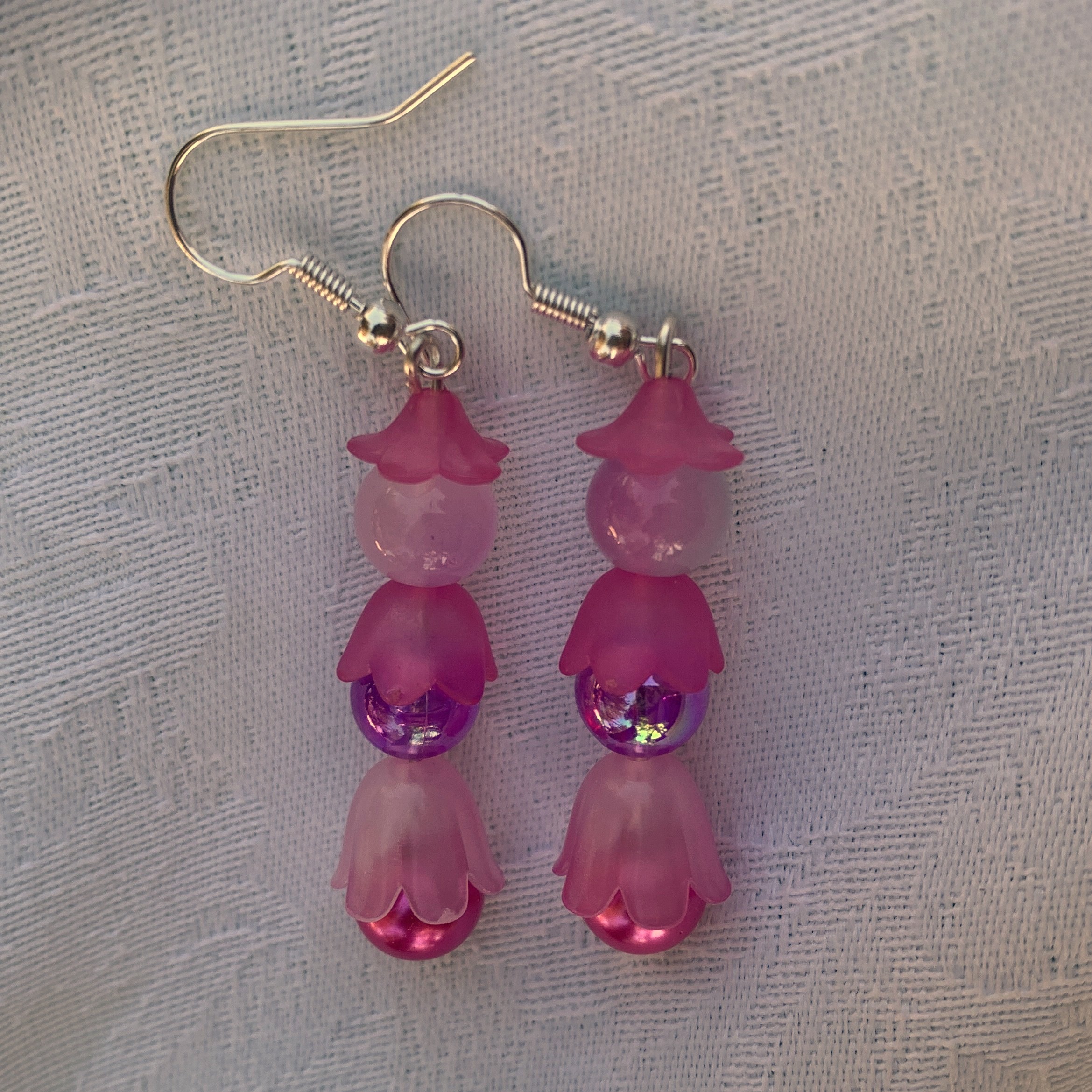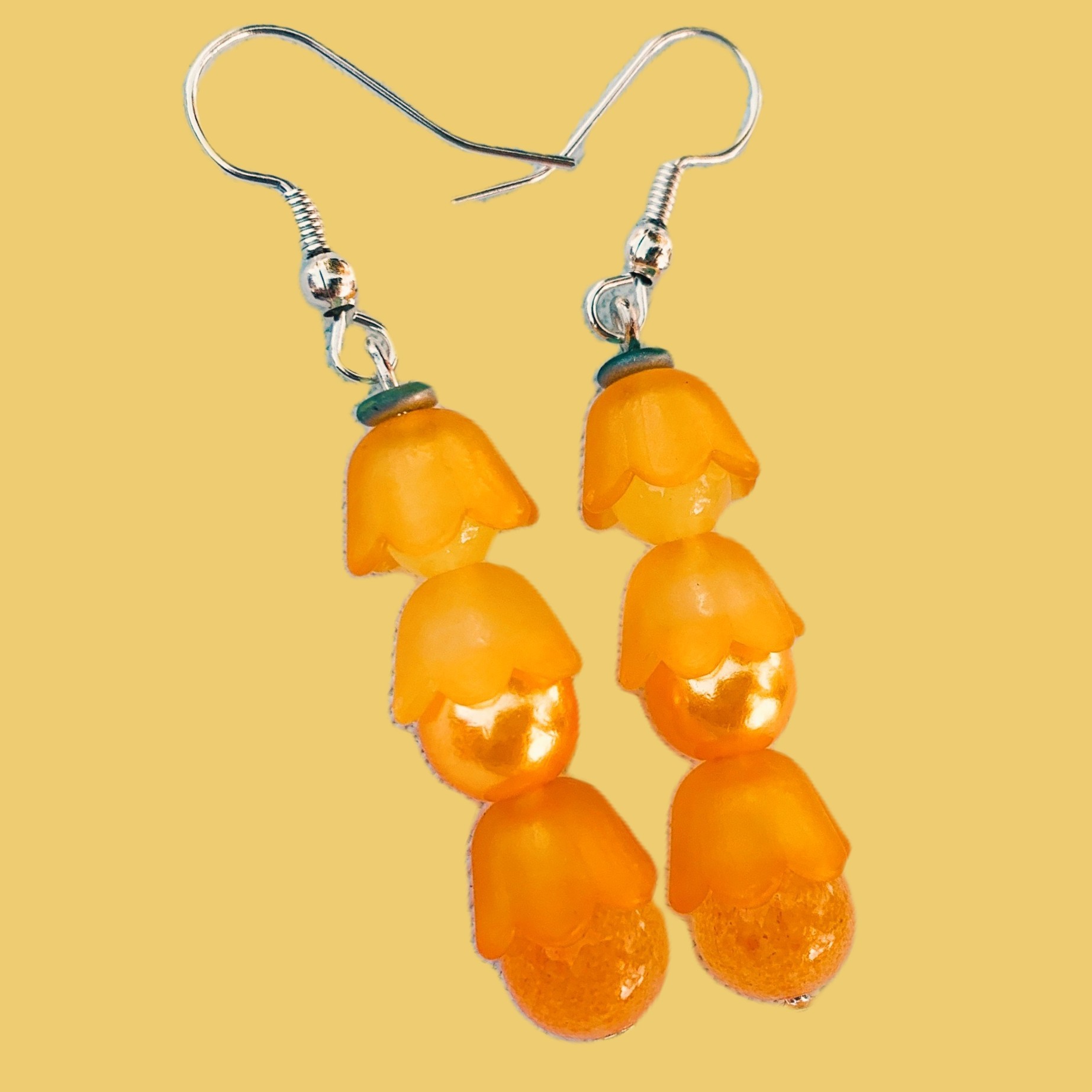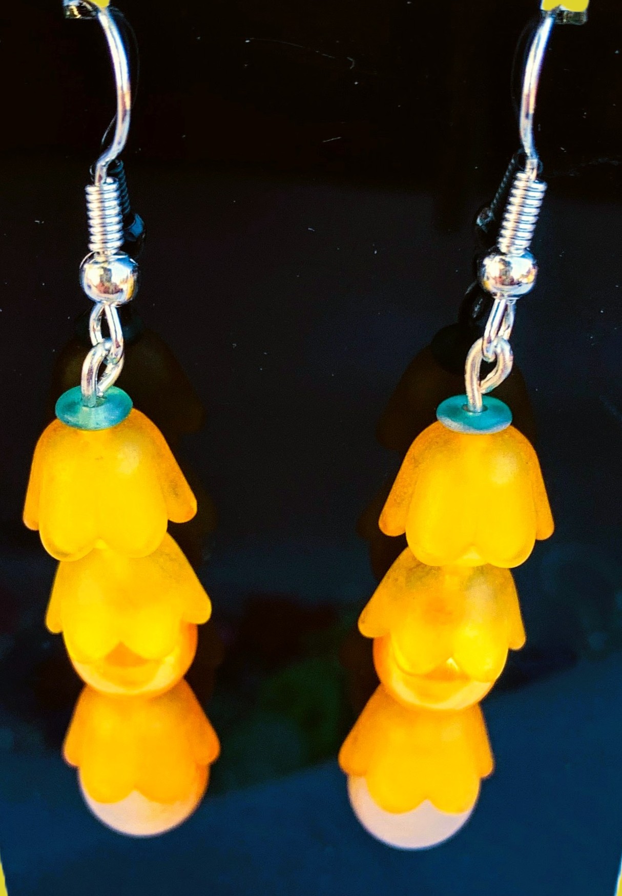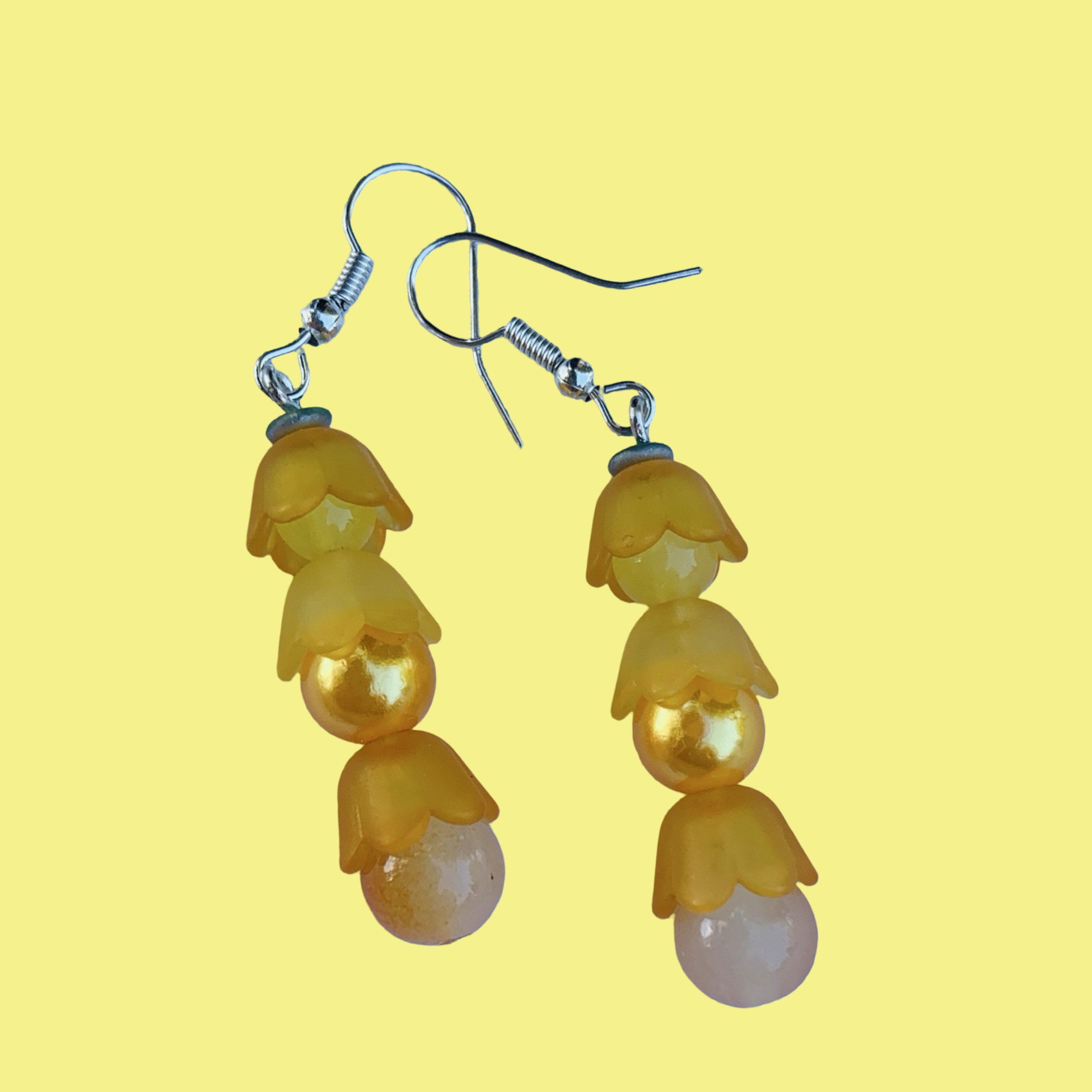 Very similar to “Flower Girl” earrings, these include or are completely made with larger beads, nestled in flower caps.