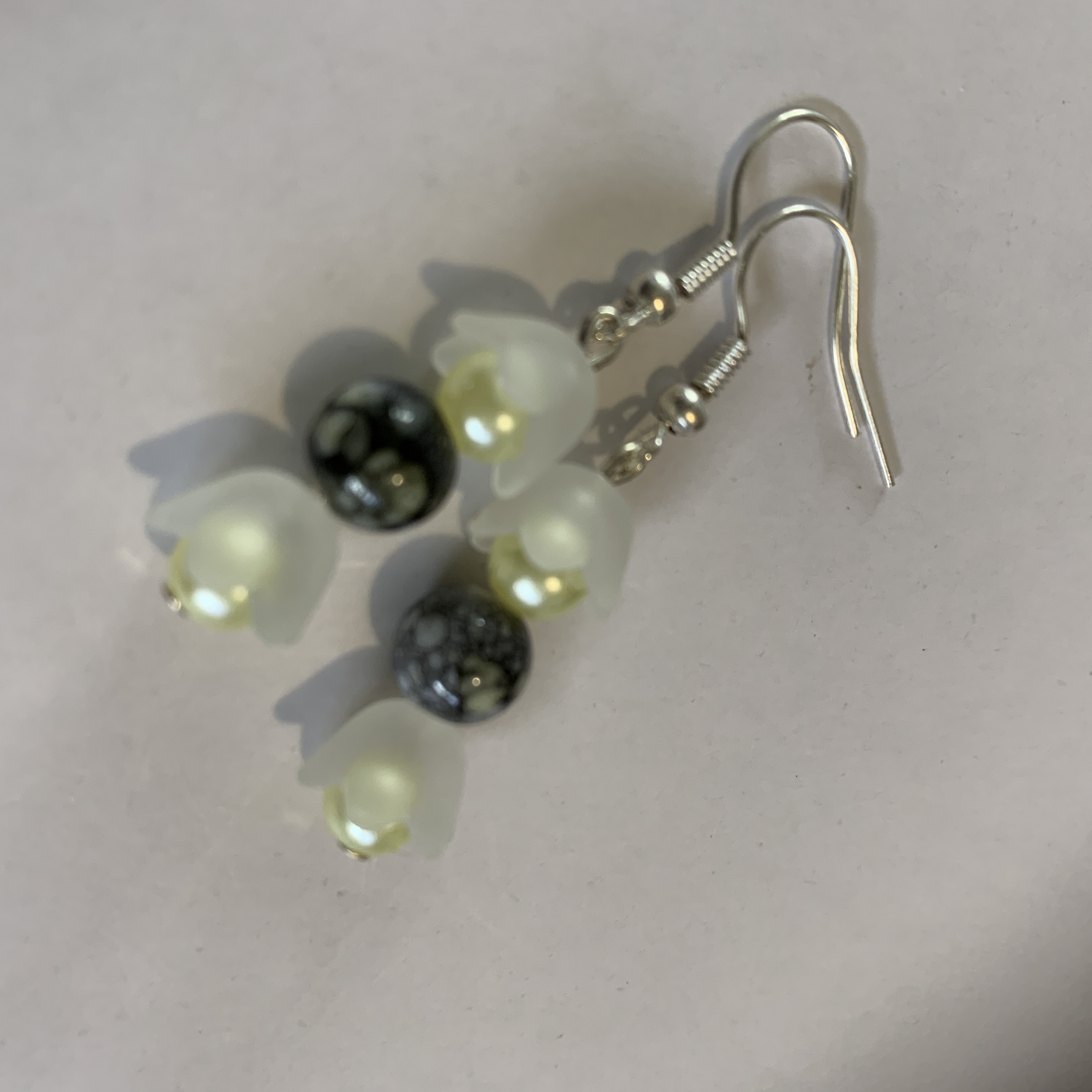 Glass Pearl and Mottled Stone Bead Flower Cap earrings: