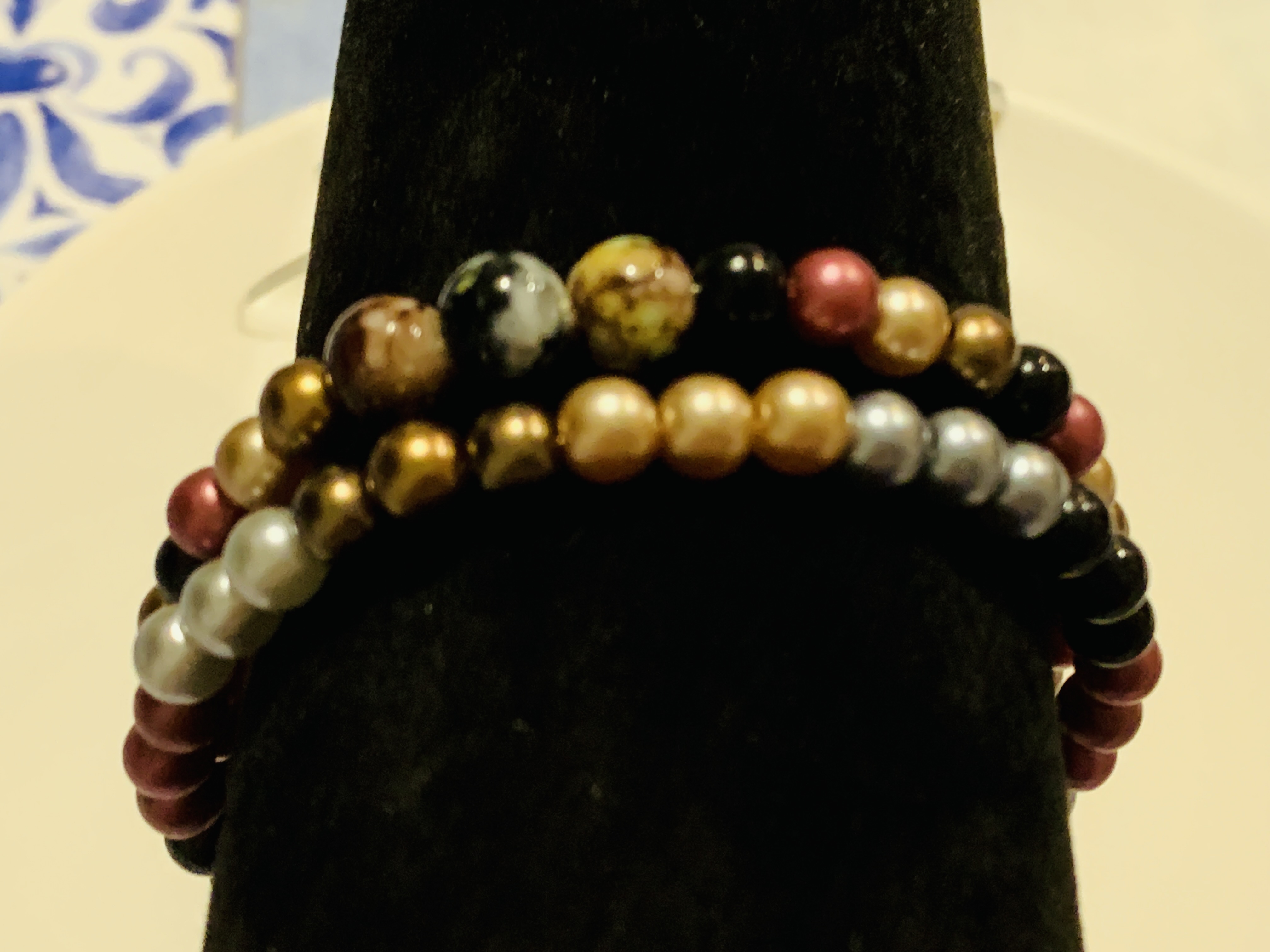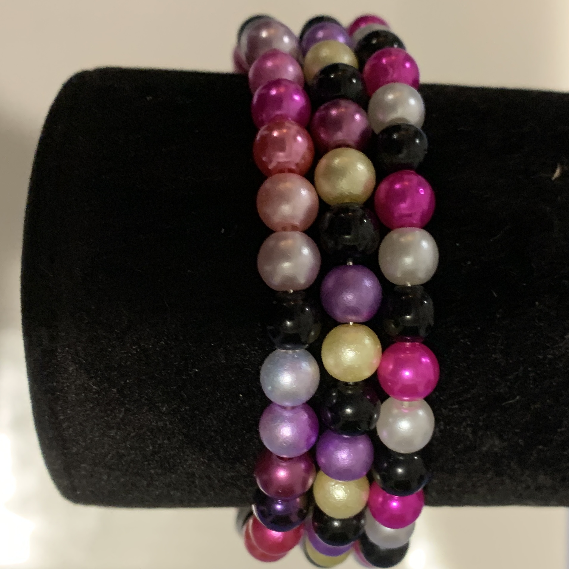 New additions to my Novelty range: Carnivale-themed jewellery featuring big shiny globe beads, and a series of glass pearl bracelets and earrings.
